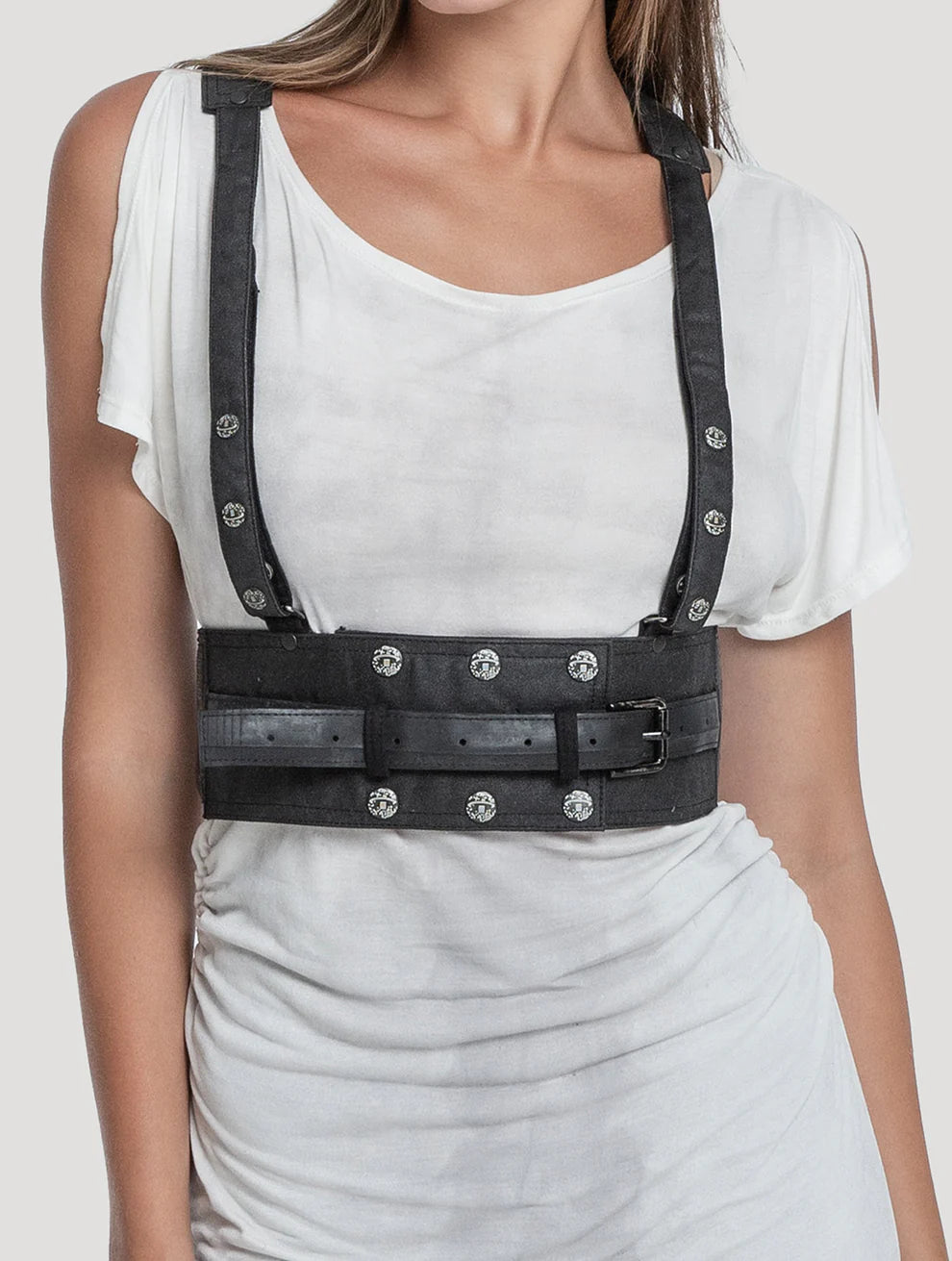 Adjustable shoulder "suspenders" straps with custom-made metal snap-buttons closure. Custom-made metal ring, for extra hooking. Plenty of buckle holes - adjustable to fit waist size 26.7 to 29.9 inches / 68 to 76 cm.