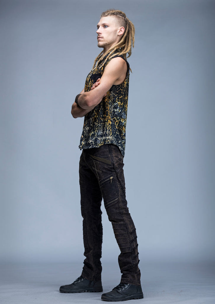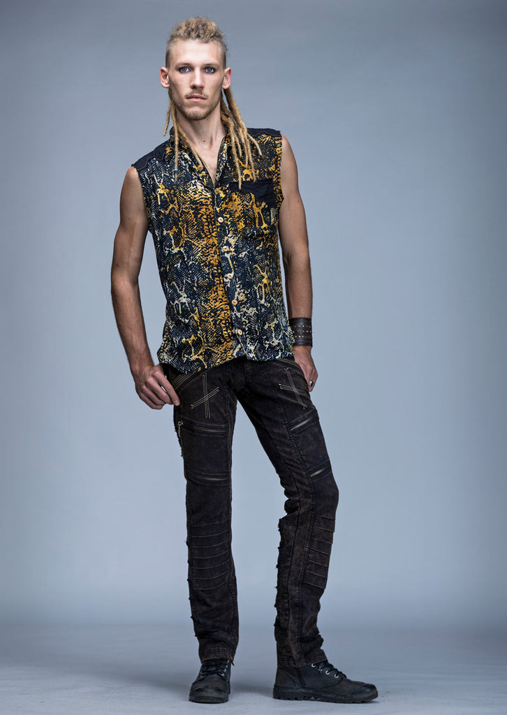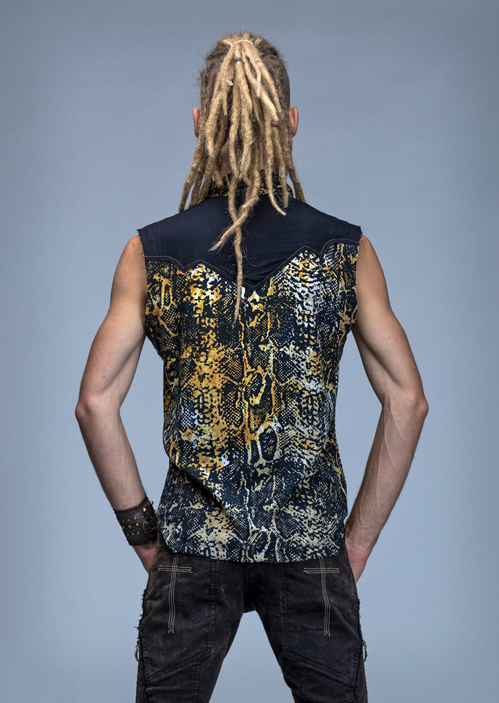 The super stylish serpent shirt is a tailored, sleeveless, lightweight design printed with an organic serpent pattern on the fabric. It will keep you cool and looking hot, and is masculine, raw and edgy. It can be dressed up for a formal occasion or dressed down for something more casual.